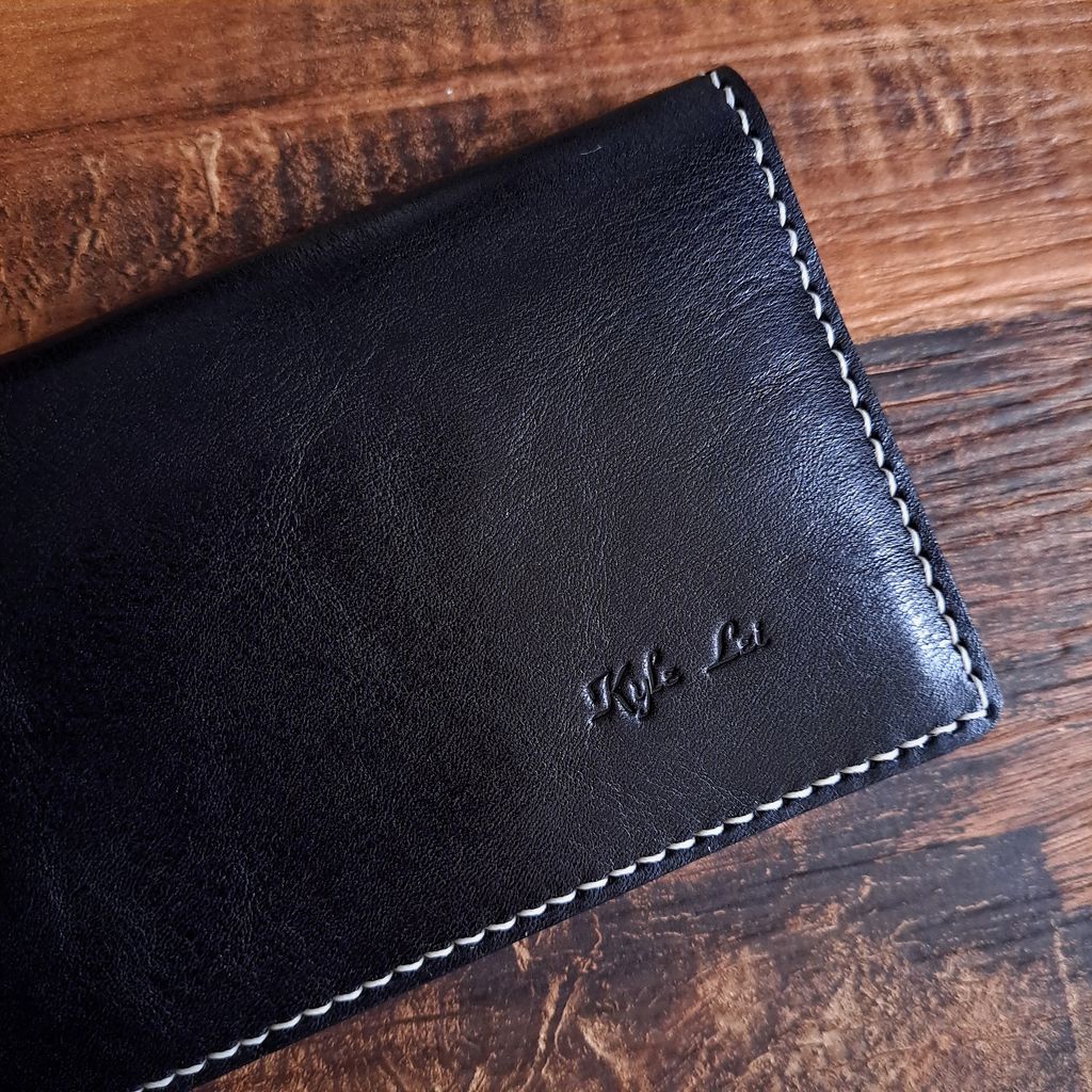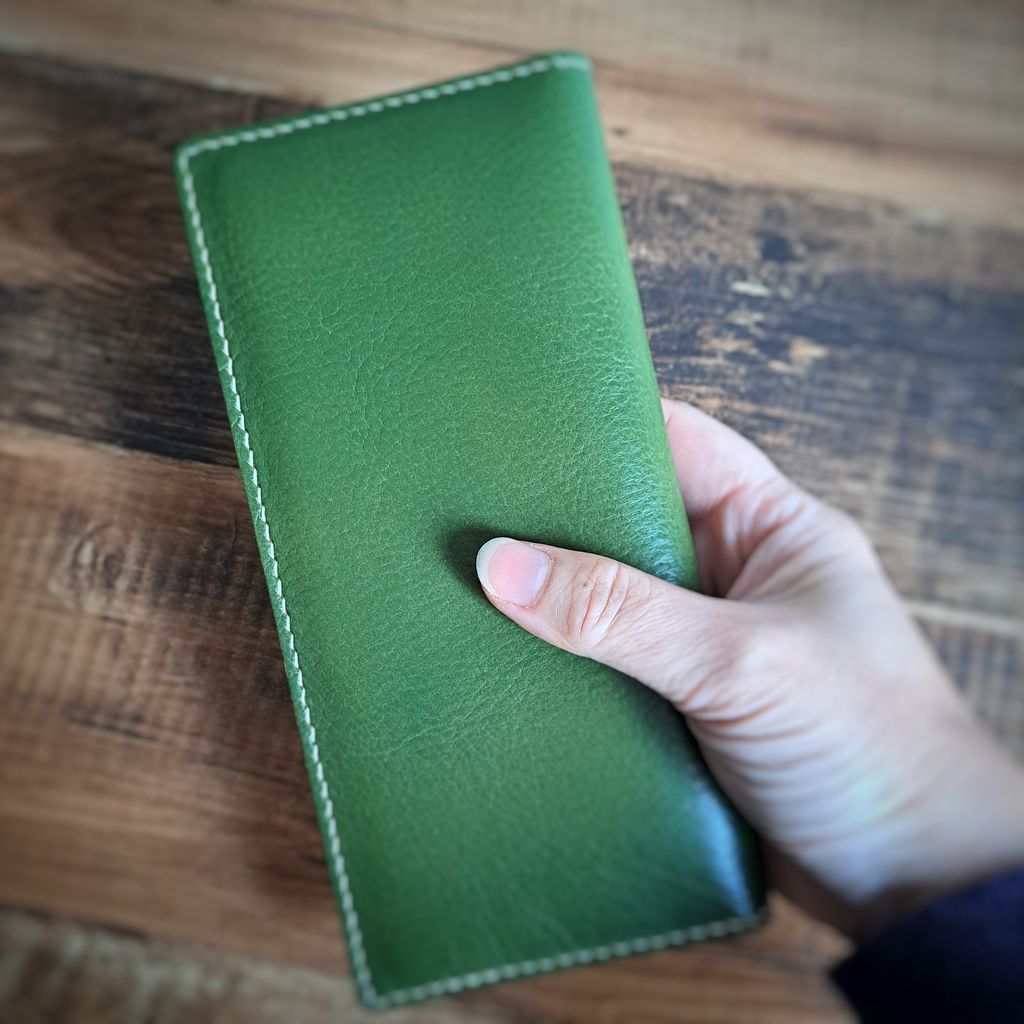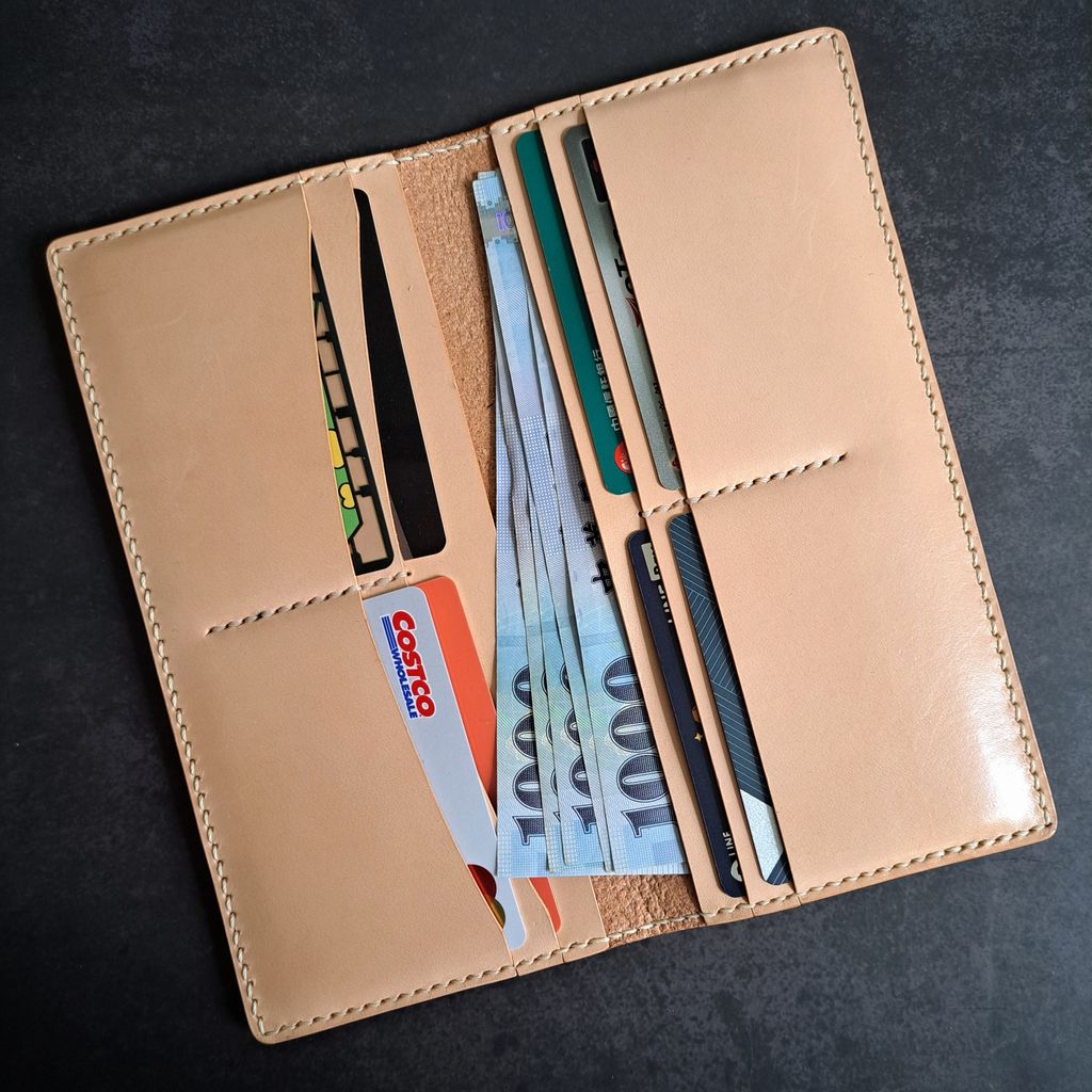 手工縫製的長夾,採用義大利植鞣牛皮製作,簡約輕薄,卻可以置放8張卡片及約20張紙鈔及收據,可以有效管理皮夾的內容物,保持在夠用卻不雜亂的狀況