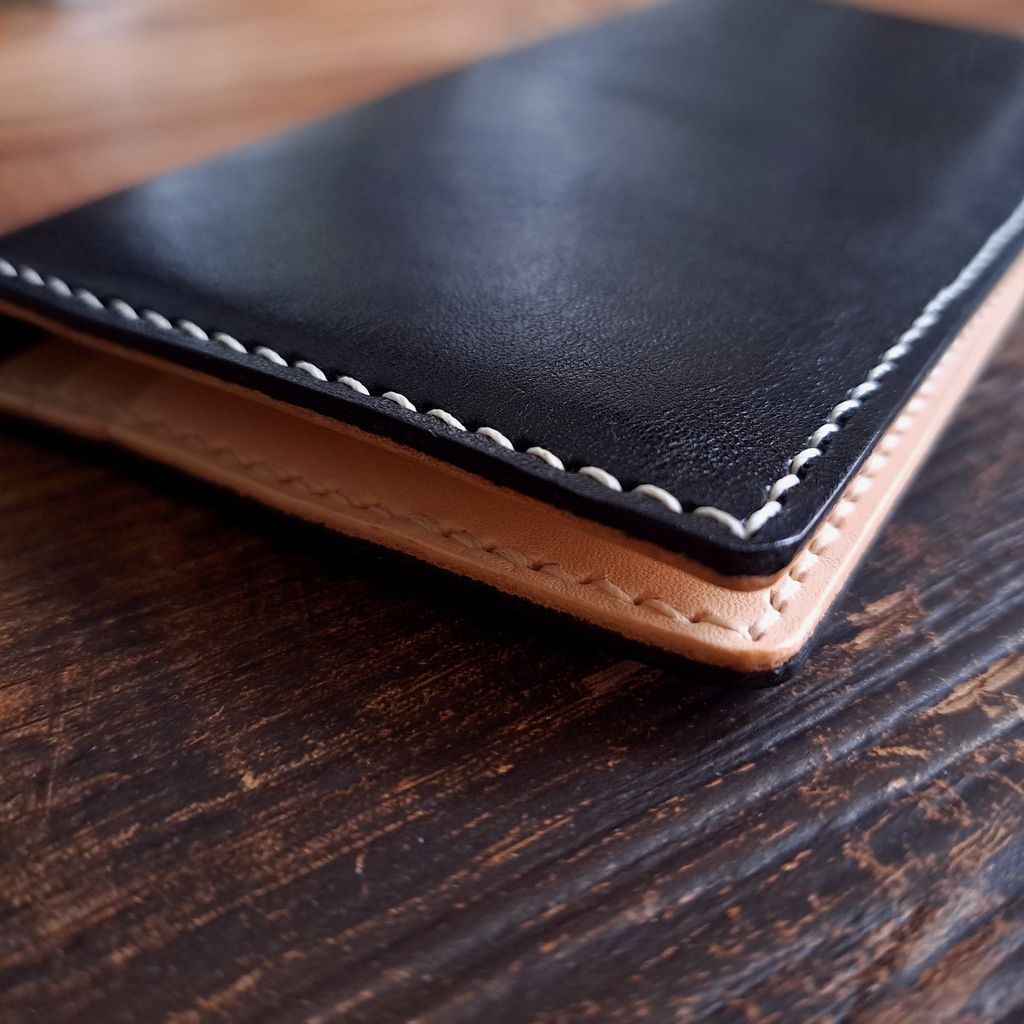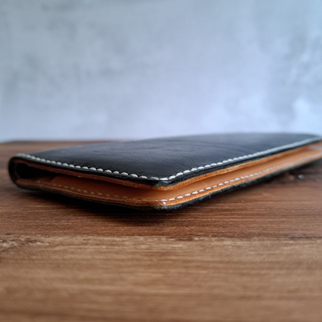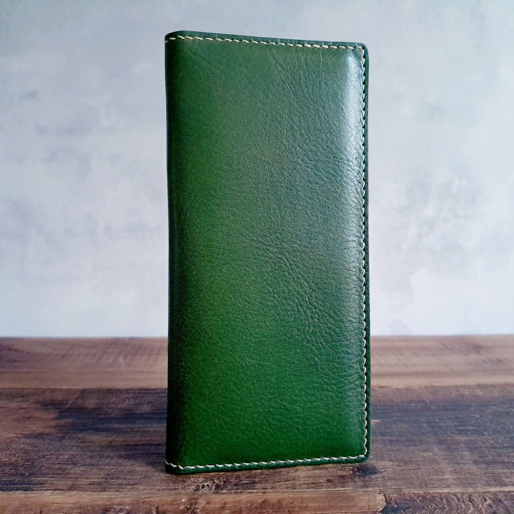 手工縫製的長夾,採用義大利植鞣牛皮製作,簡約輕薄,卻可以置放8張卡片及約20張紙鈔及收據,可以有效管理皮夾的內容物,保持在夠用卻不雜亂的狀況